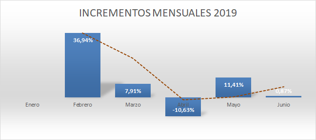 Excepto Abril, todos los meses han experimentado un crecimiento respecto del mes anterior, si bien, en el total del año 2019, los concursos se han incrementado un 14.50% respecto del total del año 2018.