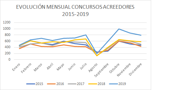 Todos los meses del 2019, la publicación de concursos y de acuerdo de homologación judicial de deudas han superado las publicaciones de cualquier mes homólogo desde el 2015.